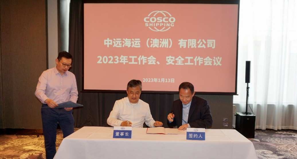 On January 13, 2023, COSCO Shipping (Oceania) Pty., Ltd. held the 2023 Annual Work Meeting and Safety Work Meeting. Mr Zhang Dayu, Chairman/President of COSCO Shipping (Oceania) Pty., Ltd., made a report on the work of Australia and New Zealand at the main venue. Vice President Gong Qing conveyed the spirit of the 2023 working conference of the Group Company, and Vice President Kang Chuanya conveyed the spirit of the 2023 working conference of COSCO Shipping Line Co., Ltd. and made a regional safety work report. The meeting reviewed the work and achievements of Australia and New Zealand in 2022 from the aspects of Production and Operation, Strategic Guidance, Deepening Reform, and Risk Prevention, and analyzed the current situation and challenges. The objectives and tasks for the overall work of the region in 2023 were put forward: First, to anchor the course and accelerate the construction of regional digital supply chain capacity; Second, we should concentrate on the benefits and promote the stable growth of enterprise benefits; Third, we should take the initiative to effectively promote the steady realization of the annual goals; Fourth, we should work steadily to resist pressure and build a solid foundation for high-quality development and safety. At the meeting, the collective and individual who won the title of group, collection and regional advanced in 2022, as well as the star employees of the Australia and New Zealand branch were commended. Mr Zhang Dayu, Chairman/President of the Board of Directors, signed 《the Letter of Responsibility for Business Performance》 and 《the Letter of Responsibility for Work Safety and Ecological Environment Protection》 in 2023 with the heads of all subsidiaries. | ||||||